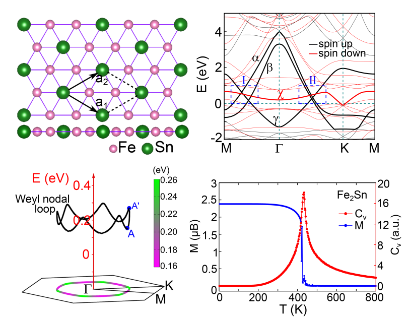 Recently, Professor Yu Jia theoretically reported that the two dimensional ferromagnetic Fe2Sn monolayer with a planar geometry and an out-of-plane magnetic easy axis exhibits the massless Weyl nodal lines, and the research work is published on Phys. Rev. B, 101, 165403.