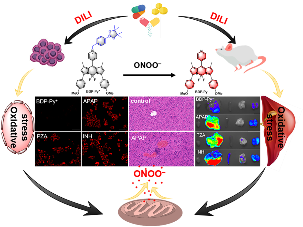 Pyrazinamide (PZA), isoniazid (INH) and rifampicin (RFP) are all commonly used anti-tuberculosis drugs in clinical practice, and long-term medication may cause severe liver damage and toxicity. The level of peroxynitrite (ONOO–) generated in liver has long been regarded as a biomarker for the prediction and measurement of drug-induced liver injury (DILI). In this article, we constructed a BODIPY-based fluorescent probe (BDP-Py+) that enabled quickly and sensitively detect and image ONOO– in vivo. Utilizing this probe, we demonstrated the change of ONOO– content in cells and mice model of DILI induced by acetaminophen (APAP), and for the first time revealed the mechanism of liver injury induced by antituberculosis drug PZA. Comparing with the existing serum enzymes detection and H&E staining, the probe could achieve early diagnosis of DILI before solid lesions in liver via monitoring the up-regulation of ONOO– levels. Collectively, this work will promote the understanding of the pathogenesis of anti-tuberculosis drug induced liver injury (ATB-DILI), and provide a powerful tool for the early diagnosis and treatment of DILI.