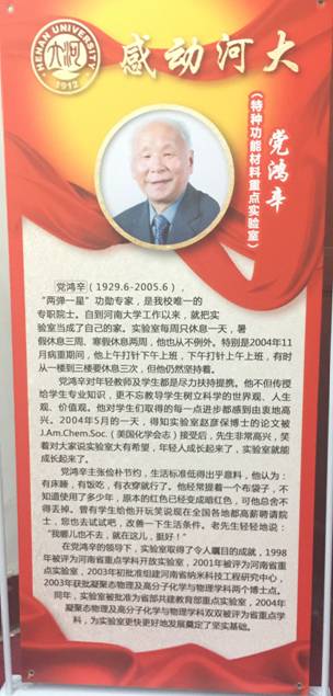 党鸿辛院士为河南大学的化学、物理以及材料等学科领域的快速发展和人才培养,作出了卓著贡献,他把生命最后的岁月都献给了中原大地,他在这片沃土上开创的事业正沿着“产学研”一体化的方向高歌前行,为中西部地区材料与能源资源的高效开发利用,为中原经济崛起和发展提供着越来越有力地支撑。