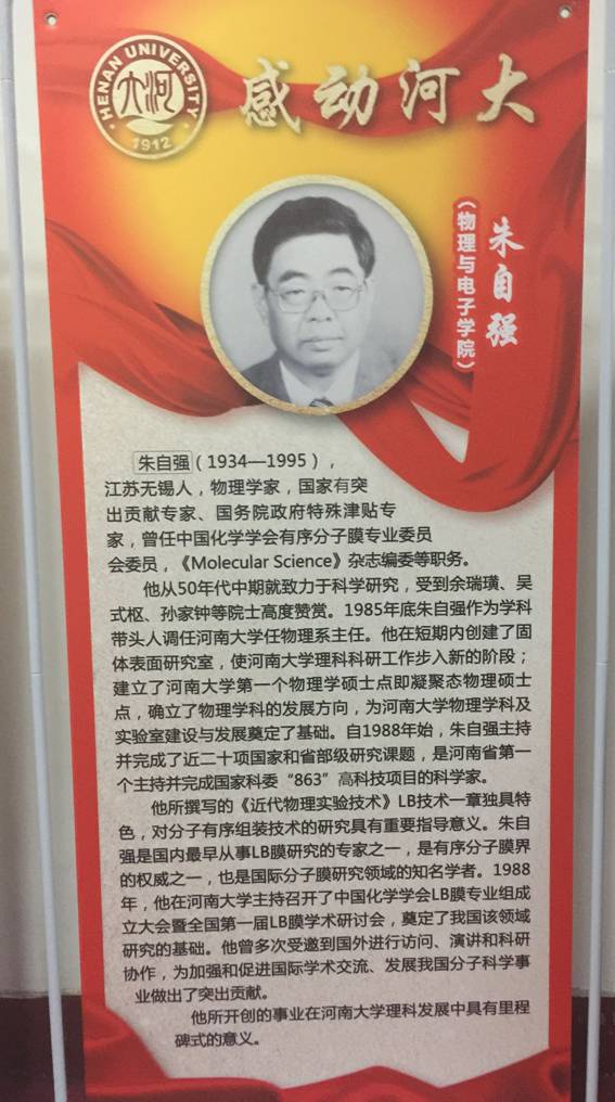 1985年底朱先生作为专家被引进河南大学,任物理系主任。通过艰辛的努力,在短期内,创建了的固体表面研究室,使我校理科科研工作步入新的阶段;建立了河南大学第一个物理学硕士点,确立了我校物理学科的发展方向。多年来他和他的同事们为物理学及相关学科的发展付出了艰苦的劳动。短短几年,先生主持并完成了近20项国家和省部级研究课题,在国际、国内学术会议和国内外核心杂志上发表学术论文百余篇,他撰写的《近代物理实验技术》LB技术一章对分子有序组装技术的论述独具特色,对该方面的研究具有重大指导意义。