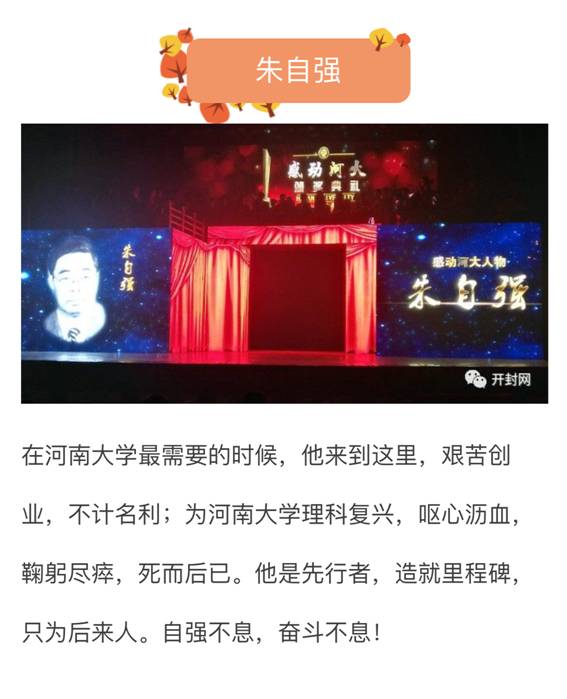 组委会给朱先生的颁奖词是:在河南大学最需要的时候,他来到这里,艰苦创业,不计名利;为河南大学理科复兴,呕心沥血,鞠躬尽瘁死,而后已。他是先行者,造就里程碑,只为后来人。自强不息,奋斗不息!