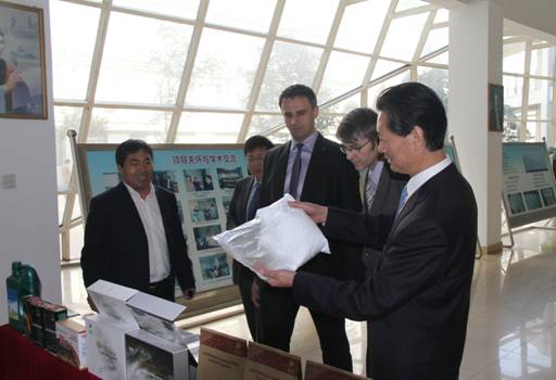 奇莫拉州长一行刚到实验室楼前,娄校长就兴奋的说:“今天我来做讲解。”说完他就开始热情洋溢的介绍起实验室的基本情况。他说,特种功能材料重点实验室主要从事纳米材料开发和应用,其特色是利用纳米科技发展新材料新能源技术,实现能源的高效开采和转化。走到实验室纳米材料成果展示区前,娄校长介绍了实验室已经完成成果转化的纳米自修复润滑材料——神铜节能修复剂的应用,娄校长还拿起了纳米二氧化硅系列产品,介绍了其系列产品的性能和在低品油田开采、高性能橡胶等领域的技术应用。