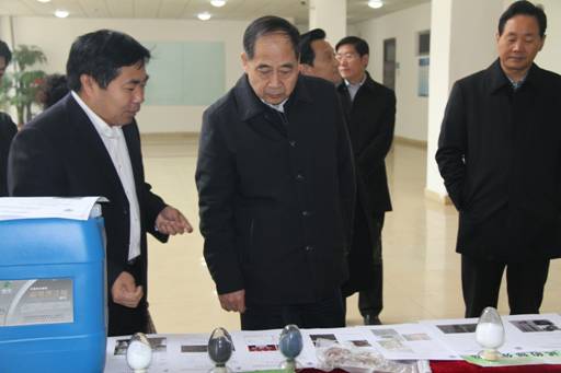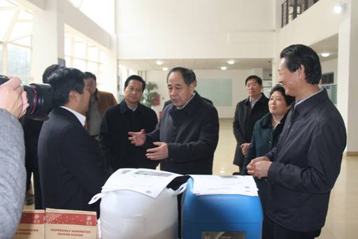 来到实验室纳米材料成果展示区,杜祖亮教授向尹书记详细汇报了目前实验室已经开展的成果转化方面的工作。实验室的纳米自修复润滑材料成果已经转让给相关企业;纳米二氧化硅系列产品已经在低品油田开采、高压绝缘材料、高性能橡胶等领域有了广泛的应用;锂离子电池的负极材料、ATO隔热材料和铜纳米线等材料的研发工作也取得了较好的成果。