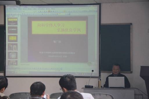 邹院士首先就河南大学校训明德新民,止于至善做了简明阐述,并介绍了实验室团结、协作、创新、拼搏精神的内涵。之后他详细讲述了科学伟人爱因斯坦的一生传奇历程,并与同学们分享了爱因斯坦成功的秘籍,即A=X+Y+Z。A 代表成功,X代表努力工作,Y 代表懂得休息,Z 代表少說废话。随后邹院士引导同学们从爱因斯坦的故事中得到科学探索的启示:强烈的求知欲望,理性的质疑精神,深邃的思考能力,缜密的分析方法,严谨的科学态度,不懈的奋斗意志。邹院士的讲座条理清晰、逻辑严密,更含幽默诙谐的言辞,他谦逊的态度,和蔼的面容,亲切的话语,博学的见解得到了师生们的阵阵掌声。