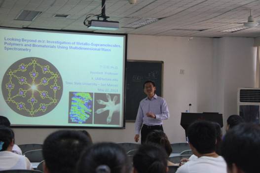 5月22日上午,应特种功能材料重点实验室的邀请,美国德克萨斯州立大学副教授李霄鹏博士访问特种功能材料重点实验室并在实验室二楼报告厅做了一场题为:“Looking Beyond m/z: Investigation of Metallo-Supramolecules, Polymers and Biomaterials Using Multidimensional Mass Spectrometry”的学术报告。报告会由白锋教授主持,特种功能材料重点实验室的师生参加了报告会。
