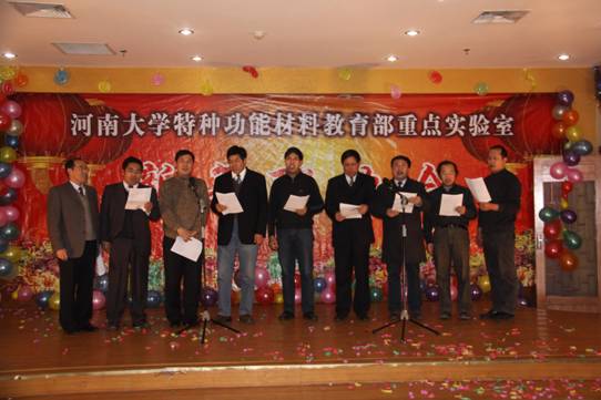 晚会开始前,由实验室党总支书记崔元臣教授代表实验室领导做新年讲话,首先对学校领导和各职能部门一年来对实验室的关注和支持表示感谢,希望实验室师生继续贯彻科学发展观建设创新型国家重要思想,克服艰难险阻为实验室的明天多做贡献。今年的元旦晚会有幸邀请到河南大学党委书记关爱和教授,关书记通过回顾学校最近几十年的发展再到实验室近些年来的发展中指出,实验室师生要继续奋斗,把实验室推向更高层次,为学校建设高水平大学做出更大贡献。