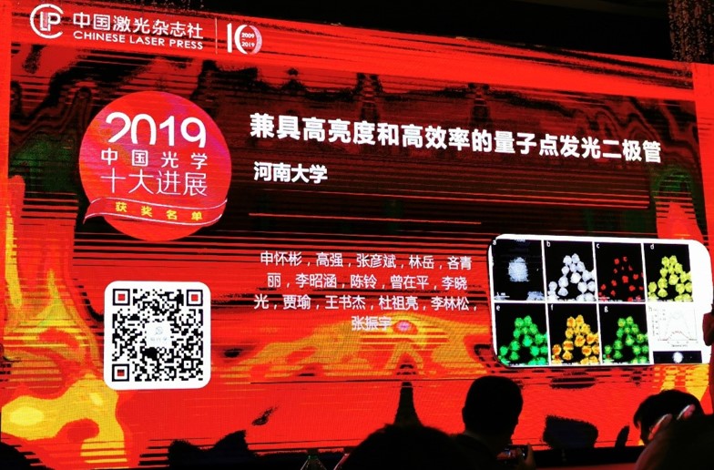 /高效显示与照明技术国家地方联合工程研究中心/材料学院申怀彬教授、李林松教授、杜祖亮教授团队与中国科学技术大学张振宇教授团队合作取得的成果——“兼具高亮度和高效率的量子点发光二极管”—— 获评2019年度中国光学十大进展(基础研究类)。评选委员会主席范滇元院士等向获奖代表颁发了奖杯和证书。