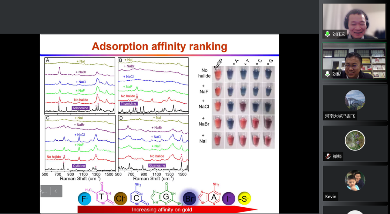 会后,刘珏文教授同线上众多师生就DNA在反应中是否会脱落以及纳米酶在传感方面的发展等问题进行了深入的讨论和交流,为纳米酶的进一步发展提出了自己的建议。