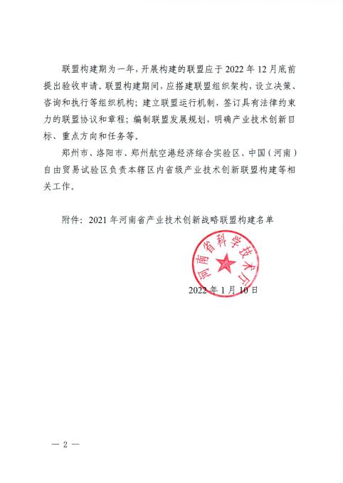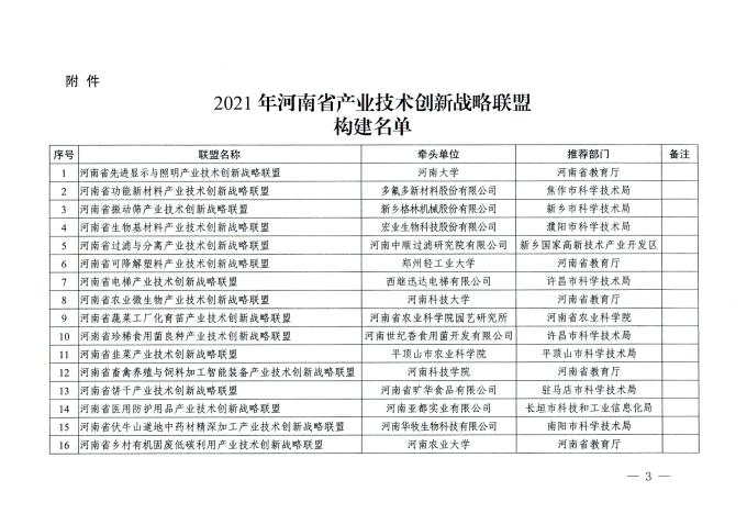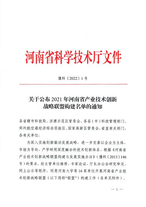 相关链接://kjt.henan.gov.cn/2022/01-25/2388129.html 关于公布2021年河南省产业技术创新战略联盟构建名单的通知_河南科技网 (henan.gov.cn)