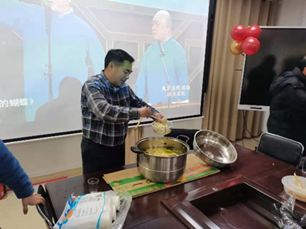 杜祖亮首先向在座的同学们致以节日的祝福和新春的祝愿,询问了留校学生的情况,嘱咐同学们科研一定注意安全,增强安全意识,合理规划寒假科研学习生活,再次强调学院为同学们做好保障服务,让每一个留校学生在实验室都感受到大家庭的温暖,在实验室度过温馨的春节。杜祖亮为大家带来信阳特色菜鸡汤豆皮,供大家品尝。大家一起品味喜庆“年”的味道,感受“家”的温暖。
