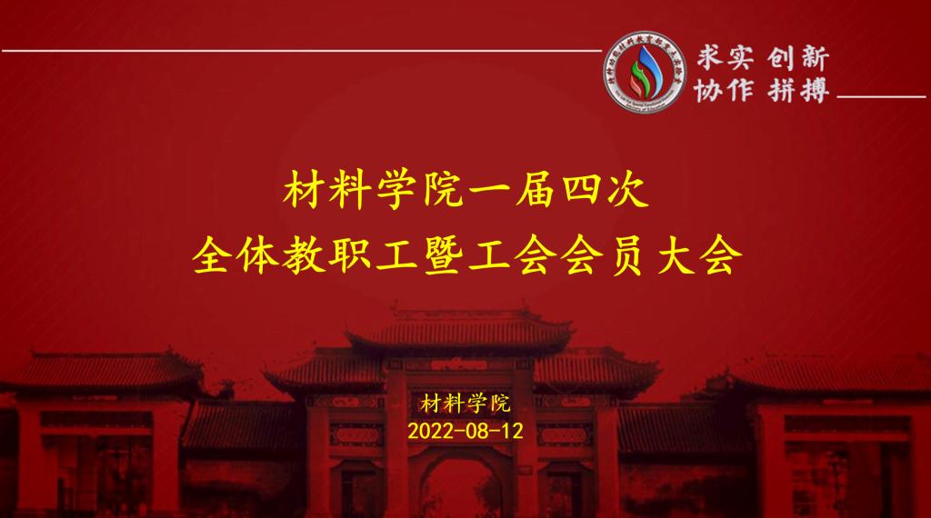 8月12日上午,材料学院一届四次全体教职工暨工会会员大会顺利召开。会议以线上线下结合方式,特聘教授及班子成员在地下室主会场,其他教职工以视频会议线上参会。会议由学院工会主席刘谨同志主持。