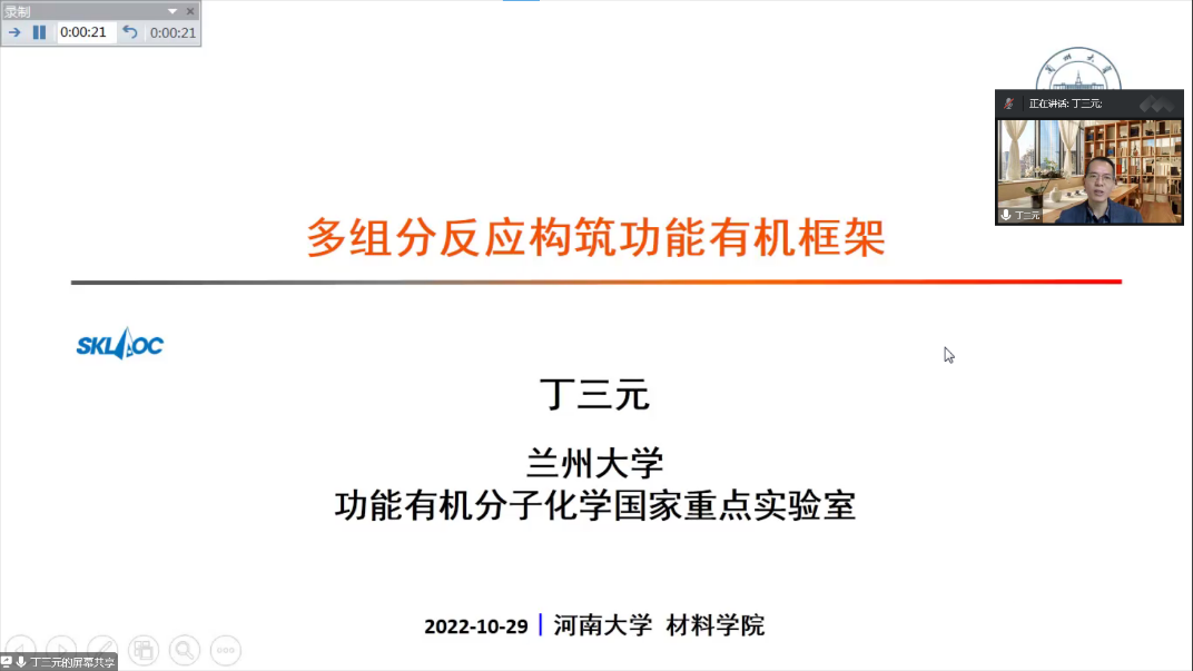 2022年10月29日上午9点30分,应河南大学材料学院邀请,兰州大学丁三元教授做客“庆祝河南大学110周年学术系列活动”,以《多组分反应构筑功能有机框架》为题进行了精彩的学术报告。材料学院白锋教授主持了报告,报告采取线上模式(腾讯会议)进行,全校相关领域约60名教师与研究生参加了此次报告。