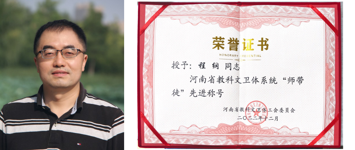 程纲教授被河南省教科文卫体工会委员会授予河南省教科文卫体系统“师带徒”先进称号。为推动全省师带徒、“匠”带兵行动持续向纵深发展,树立工作典型,发挥示范引领作用,河南省教科文卫体工会委员会下发了《河南省教科文卫体工会委员会关于命名河南省教科文卫体系统“劳模和工匠人才创新工作室”、工匠人才、“师带徒”先进的决定》。