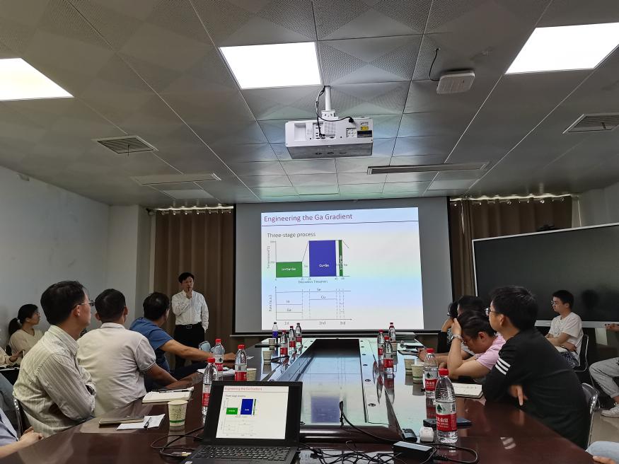 肖旭东老师为大家作了以“高效钙钛矿/铜铟镓硒叠层电池的制备”为主题的报告,内容主要分为铜铟镓硒电池能带工程和钙钛矿/铜铟镓硒叠层电池两部分。第一部分,通过三步共蒸发法制备吸收层,通过设计不同步骤的镓、铟等的蒸发参数,得到了优化的“U”型带隙,减少了界面处的载流子复合,使得制备的的铜铟镓硒电池获得了21.3%的光电转换效率。进一步,介绍了一种可以减少制备成本的亚微米厚度的铜铟镓硒电池,通过设计吸收层的生长步骤、退火工艺、生长顺序等一系列措施调整电池的GGI,在亚微米吸收层上获得了“U”型带隙,克服了其在光谱长波区域的吸收不足的问题,获得了20.13%的亚微米效率记录。第二部分,介绍了n-i-p型和p-i-n型钙钛矿/铜铟镓硒叠层电池,通过合理选择顶层和底电池吸收层的材料和厚度以及中间层材料,优化各级能级排列,制备的叠层太阳能电池能够实现对太阳光的最佳匹配吸收,极大的提高了电池的光电转换效率。