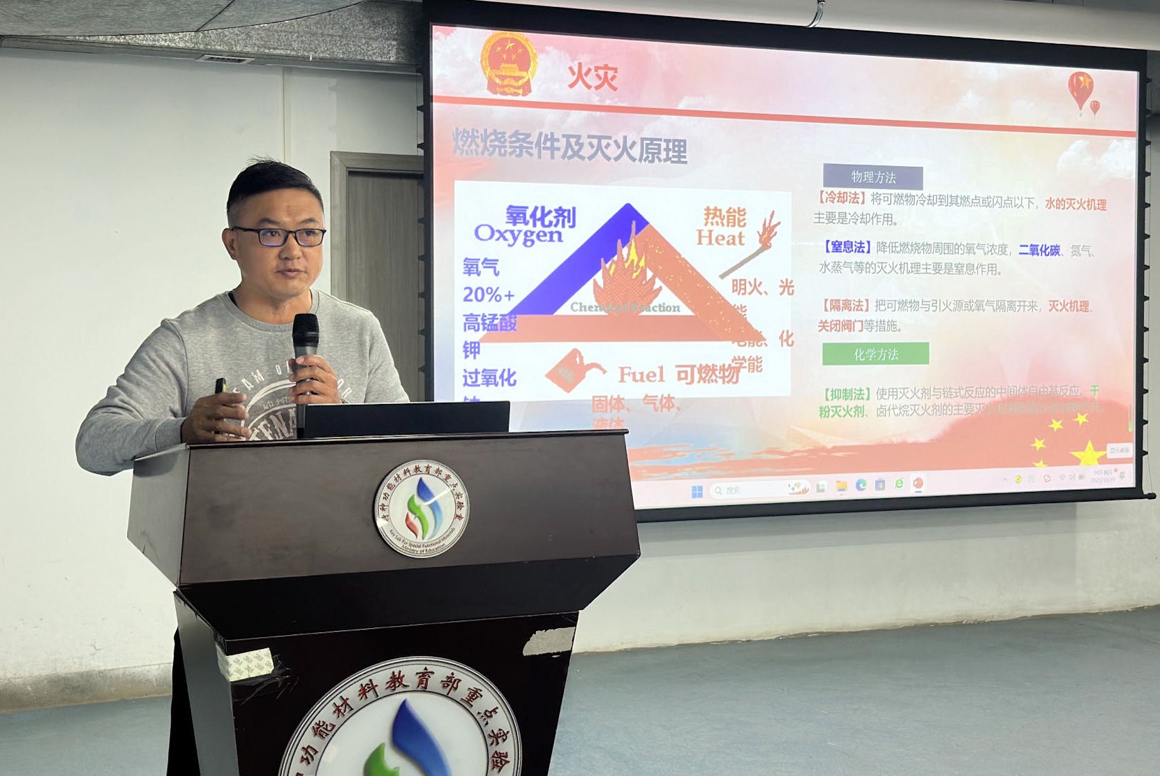 马建军向在场师生开展消防安全知识培训,详细讲解了火灾发生的根源、日常防火常识及火灾发生时的逃生自救技能等内容,并结合近年来校园发生的火灾案例具体问题具体分析,包括学生宿舍因使用违规电器引发的火灾、实验室易燃易爆物品操作不当引起的火灾等,以视频、图片等形式生动深刻地诠释了消防安全的的重要性和严峻性,使参训师生充分认识到火灾防范的责任感。