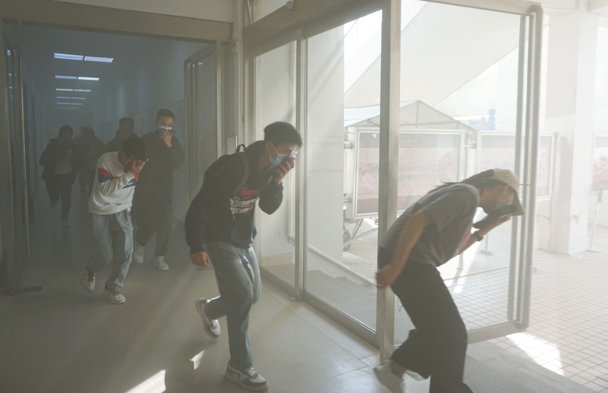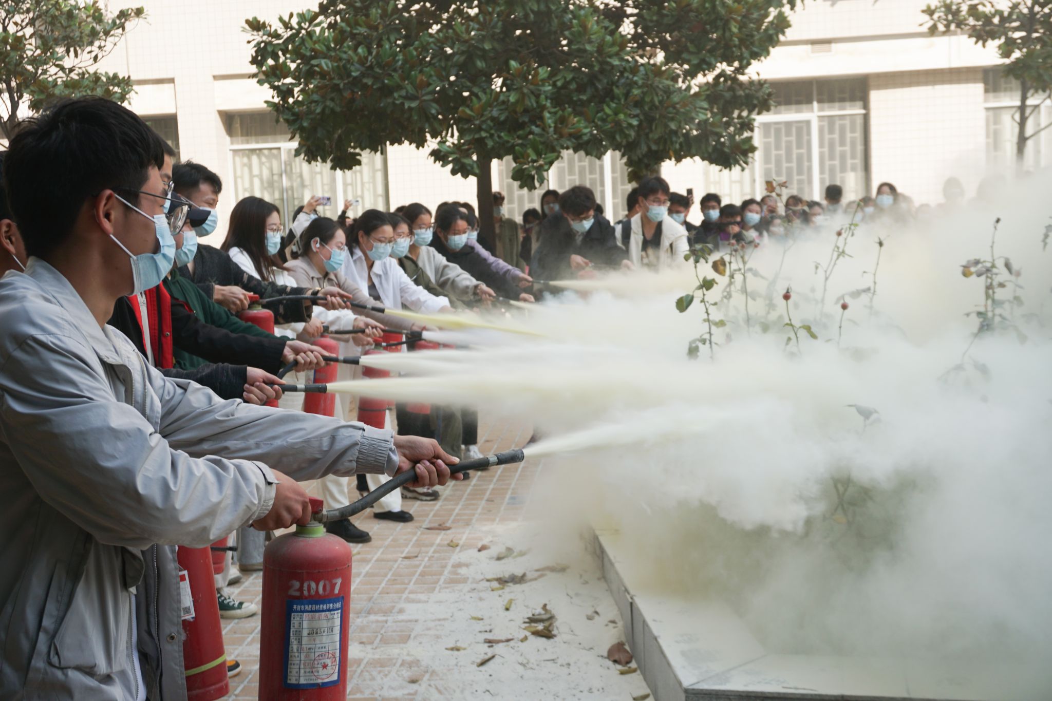 培训结束后,参加活动的全体师生在马建军等负责老师的指引下,开始火灾应急疏散演练。随着消防演习烟雾弹的燃放,大家按照预定路线,保持避险姿势,用毛巾捂住口鼻,紧张而有序的下楼疏散,在最短的时间内全部撤离到学院指定的安全区域。