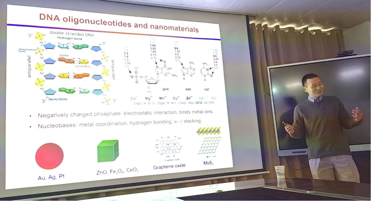 刘珏文教授作了题为“Biosensors based on aptamers and gold nanoparticles(基于适配体和金纳米颗粒的生物传感器)”的学术报告。报告会上,刘老师从DNA的碱基与金纳米颗粒之间的作用力开始讲解,探索了盐浓度、pH、温度、卤素阴离子等对DNA不同碱基序列与金颗粒间的作用力的影响,以及采用荧光修饰的DNA探索了与金纳米粒子间的作用方式,重点介绍其课题组发现很多小分子靶标都和纳米金表面有着很强的吸附作用,抑制适配体的吸附,例如多巴胺、三聚氰胺、卡拉霉素、As3+/As4+等,揭示了适配体传感器用于信号生成存在的潜在缺陷,取得了一系列重要的研究成果。刘老师还分享了其课题组创新型地引用冷冻条件,实现了金纳米粒子对DNA吸附量的新突破,在材料科学和分析生物学领域具有广泛应用前景。