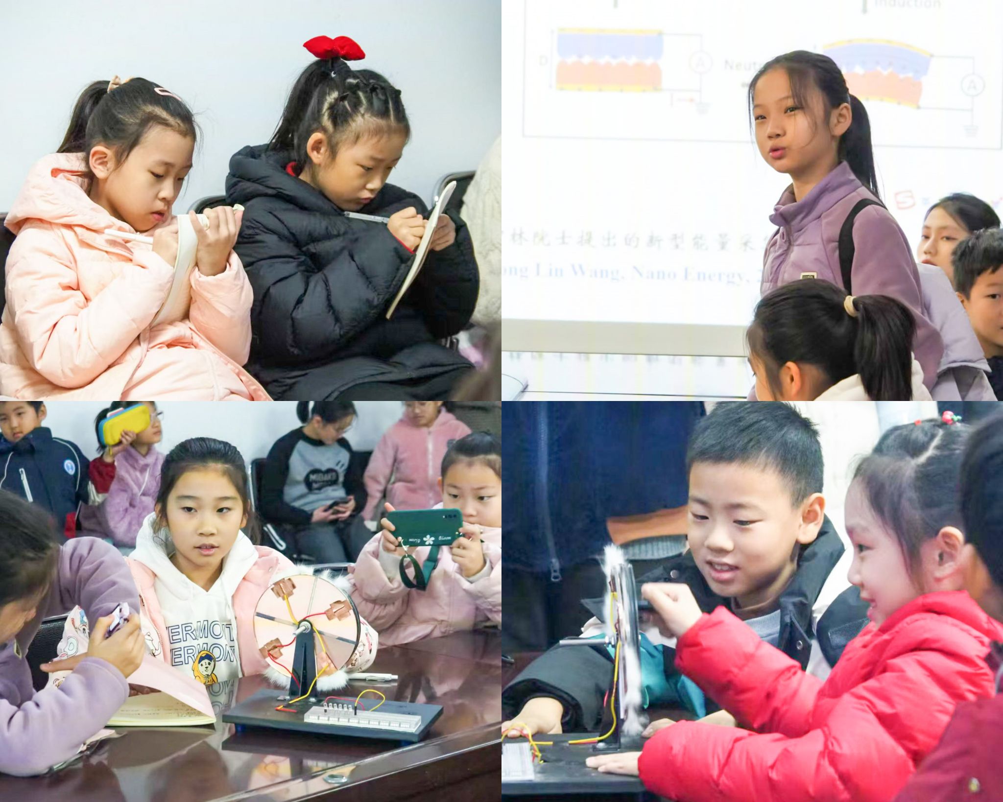 程纲教授现场展示了摩擦纳米发电机,并邀请小记者们亲身体验了新颖的发电方式,大家发出阵阵惊叹,迅速点燃了探究新知的热望。