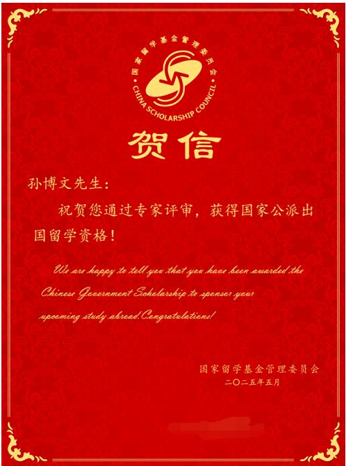 孙自许教授团队2022级硕士研究生孙博文获得公派留学资格和全额奖学金支持,即将赴海外高校攻读博士学位。