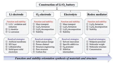 锂-氧气电池是一种具有超高理论能量密度的能量存储和转换装置,在便携式电源、电动汽车和固定电站等领域具有巨大的应用前景。深入理解电池材料组成、结构对其性能的影响对推动其发展并快速走向实用化具有重要意义。赵勇教授等人在深入分析锂-氧气电池工作原理的基础上,系统梳理并总结了电池各组件的结构特性、以及组件间的协同作用对电池总体性能的影响,提出了“以功能和稳定性为导向的电池材料设计和器件结构优化对改善电池性能具有重要意义”的研究思路(下图)。该论文将为该领域的科研和技术人员提供较好的借鉴作用。