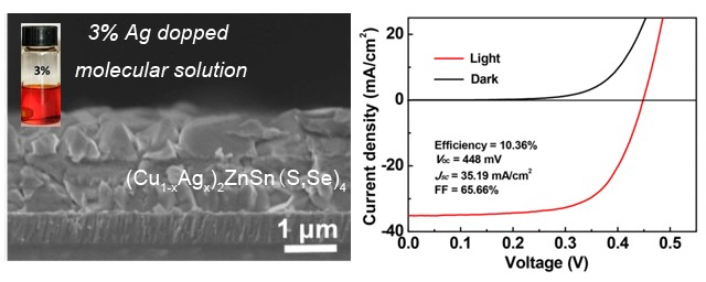 在铜锌锡硫硒薄膜太阳能电池中,由于Cu和Zn具有相似的共价半径和化学差异性,极易形成高浓度的CuZn反位受主缺陷,造成严重的开路电压损失。该研究采用乙二胺和乙二硫醇的混合溶剂为溶解体系,以铜粉、银粉、锌粉,锡粉,硫粉和硒粉为原料,制备出不同Ag+取代量的(Cu1-xAgx)2ZnSn(S,Se)4光伏吸收层材料。其优势在于既降低了成本,又避免了杂质元素的引入。采用部分Ag+取代Cu+极大程度地降低了吸收层中CuZn反位缺陷的浓度,提升了器件的开路电压。最终太阳能电池的光电转换效率由7.39 %提高到了10.36 %,该效率为目前Ag+取代法制备的铜锌锡硫薄膜太阳能电池的最高效率。该研究成果对于铜锌锡硫硒薄膜太阳能电池的研究及应用具有重要的指导意义。