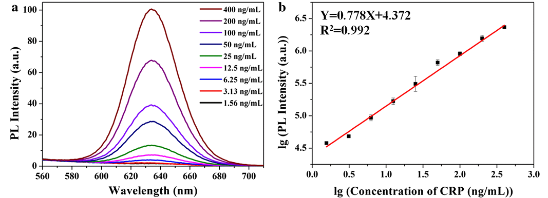 Photoluminescence spectra from FLISA for determination of CRP antigen (a) and standard curves (b) (n = 3)