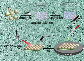 图 1. 利用单分散磁性银复合微球进行水相有机污染物探测过程示意图。