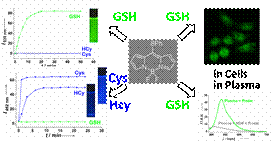 含巯基氨基酸具有重要的重要的生理功能或药理作用,对这些氨基酸的快速、便捷检测对于药品质量控制,食品分析,医疗诊断,及基础研究领域都有重要意义。项目组通过对BODIPY染料8位(Meso位)的合理修饰,利用离去基团对Cys、Hcy、GSH反应的速率和机制的差异,从两个不同检测波段实现对Cys/Hcy和GSH的区分检测,对GSH的检测极限达到10 nm (3 ppb),并且在溶液、血浆、细胞层面上都能实现区分检测。