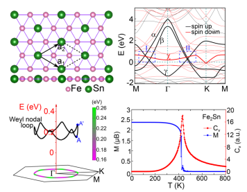 近期,贾瑜教授课题组利用理论计算预言在二维铁磁材料Fe2Sn中存在拓扑保护的外尓节点线,相关成果以“Two-dimensional topological semimetal states in monolayer Cu2Ge, Fe2Ge, and Fe2Sn”为题,以全文形式在Phys. Rev. B上发表。