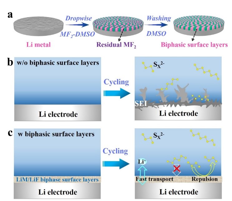 图 (a) 坚固的双相表面层构造过程的示意图;(b) 锂硫电池中多硫化物穿梭引起的锂金属腐蚀的机理;(c) 坚固的双相表面层抑制多硫化物穿梭的机制。