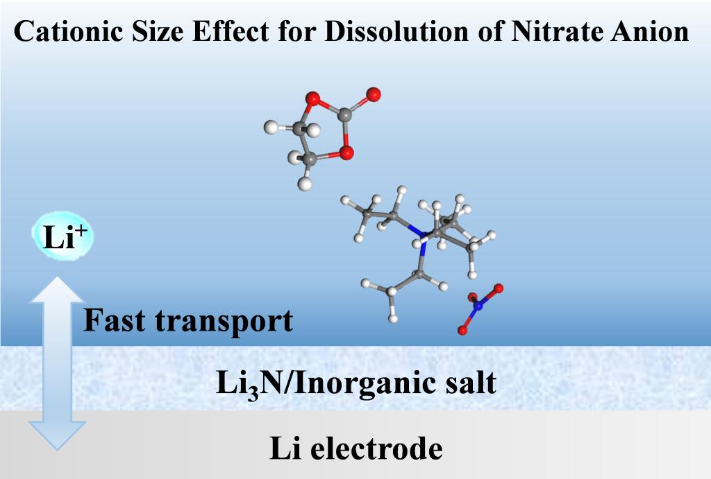 图1 利用“阳离子尺寸效应”溶解NO3-阴离子并在Li电极上形成含Li3N高离子电导率的SEI层示意图