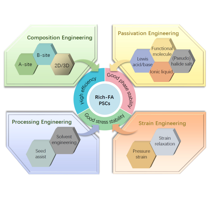 FAPbI3矿钙钛矿具有较宽的吸收光谱,被认为是最有前景的光伏材料之一。但是黑色α相FAPbI3钙钛矿在室温下易转变为不稳定的δ相,因此,科研人员对富含FA钙钛矿的相变和稳定性机理开展了大量的研究工作。本文总结了FAPbI3材料的基本物理性质,包括晶体结构、相变、载流子动力学等方面,根据已有的文献,建立了完整的相变机制。本文也讨论了外部因素(如温度、光照、湿度和氧气等)和钙钛矿自身性质(如离子尺寸、分子动力学等)对FAPbI3钙钛矿器件稳定性的影响,并总结了近年来富含FA钙钛矿太阳电池在几个主要方面的突破。另外,本文概述了提高富含FA钙钛矿稳定性的几种主要策略,包括组分工程、钝化工程、过程工程和应变工程等。最后,为制备高效率和高稳定性的钙钛矿太阳能电池提出了新的观点,为制备高性能的钙钛矿光伏器件提供了几种有价值的参考。
