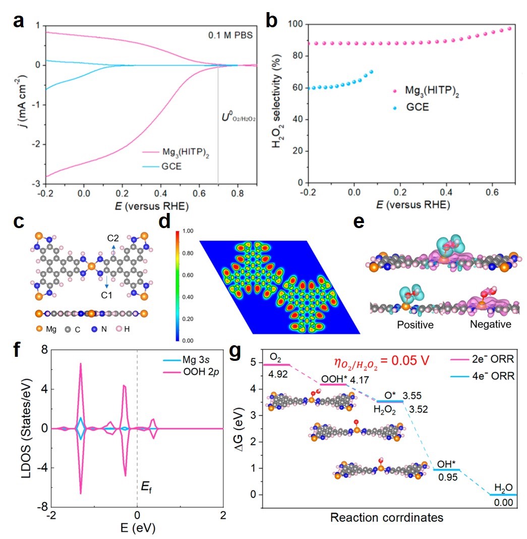 图 a,在0.1 MPBS中以1600 rpm记录Mg3(HITP)2和GCE的LSV曲线,以及分别在盘电极和环电极条件下测试的ORR和H2O2电流密度。b,通过a图计算得到的H2O2选择性。理论计算得到的c,Mg3(HITP)2原子结构;d,电子局域函数;e,电子差分密度;f,电子态密度;g,2电子ORR和4电子ORR反应自由能。