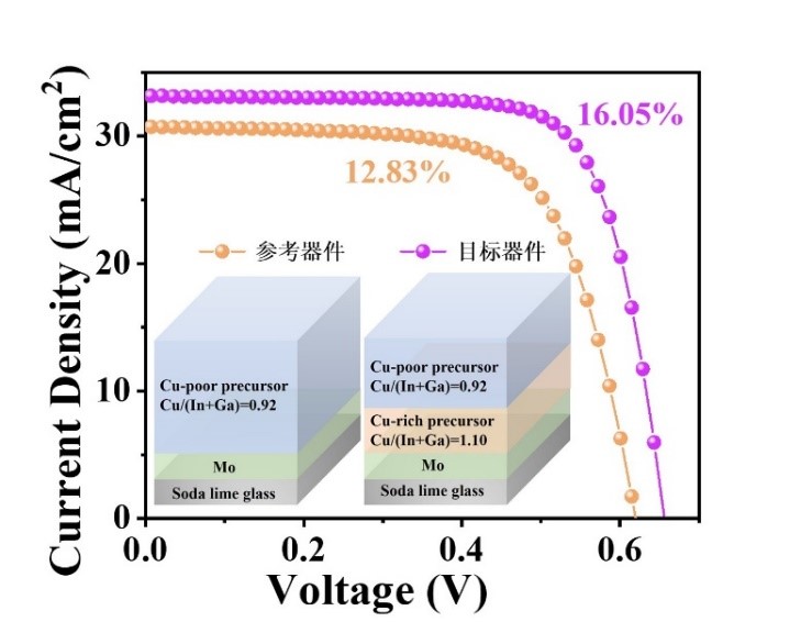 溶液法制备Cu(In,Ga)Se2 (CIGS)吸收层是一种极有前景的制备工艺。然而,溶液法制备的CIGS太阳能电池器件性能仍然受严重的非辐射复合和不理想的晶体质量制约。针对上述问题,本工作开发了一种简单有效的前驱体膜处理策略,即在CIGS前驱体膜底部引入富Cu (CGI 大于1) CIGS层,成功在溶液法中实现了富铜组分的引入。研究发现富Cu CIGS层的引入大大提高了吸收层结晶性,降低了吸收层缺陷密度。从而实现了更高效的电荷收集和分离。通过系统优化,本研究获得了16.05%的光电转换效率。该研究为改善溶液法制备的铜铟镓硒薄膜质量提供了新的技术手段。