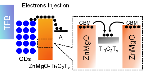 蓝光QLEDs在器件效率和稳定性方面显著低于红光和绿光器件,因此蓝光QLEDs器件性能提升是QLEDs走向商业化应用的关键挑战。在本研究中,通过低温预处理得到高质量单片层的Ti3C2Tx MXene,并利用其表面含有丰富的官能团及独特的二维片层结构将ZnMgO纳米颗粒锚定在片层上。利用两种材料功函数差异有效调控了电子传输层的导带位置,优化后的蓝色QLED器件的峰值EQE为15.81%,T50寿命达到3284 h @100 cd m-2。本研究工作首次采用二维MXene材料对电子传输层进行调控,从而实现了对其界面电荷分布的调控。该研究成果不仅拓宽了二维MXene材料的应用领域,同时为提升蓝光QLED器件的稳定性提供了思路。