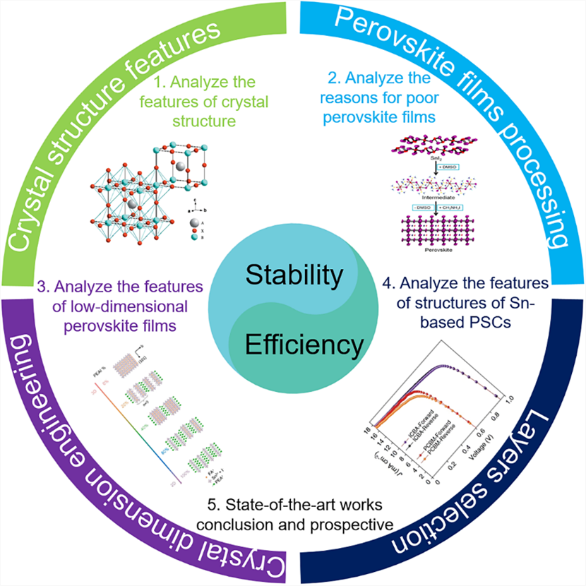 锡基钙钛矿作为第三代光伏器件潜在的候选者,其器件的理论效率高达33%。尽管如此,锡基钙钛矿器件的研究仍然面临诸多困难,如快速结晶及二价锡的氧化等。基于锡基钙钛矿的这些挑战,研究者们实施了众多策略对其进一步优化。鉴于此,河南大学李萌团队以及斯图加特大学Michael Saliba团队于Advanced Energy Materials刊发了锡基钙钛矿的最新综述。在这篇文章中,作者系统地回顾了纯锡基钙钛矿太阳能电池的最新进展,着重于制备和策略,对改善锡基钙钛矿性能的各种改性策略进行了分类。主要对影响晶体稳定性的因素进行了总结,并分析了晶体的物理性质。从薄膜制造工艺、添加剂的选择、低维结构的制备和界面层的选择四个方面对锡基钙钛矿器件的制备进行了详细的总结和讨论。最后,对纯锡基钙钛矿太阳能电池研究领域的现状和未来的研究进行了全面的展望。