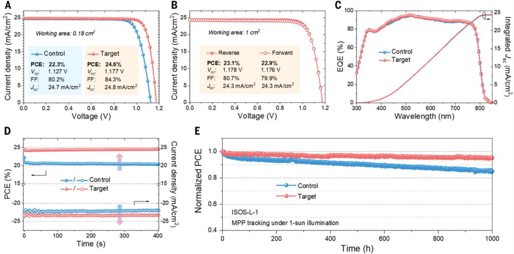 p-i-n倒置结构的PSC光伏性能如图3所示。引入β-pV2F后,器件光电性能得到改善,有效面积为0.18平方厘米的器件PCE达到了24.6%,有效面积为1平方厘米的器件PCE达到了23.1%(图3A, B)。器件在持续工作条件下的稳定性表明,在连续MPP跟踪1000小时后,目标器件保留了初始PCE的96%。相比之下,原始对照的PSC衰减到其初始PCE的84%(图3E)。