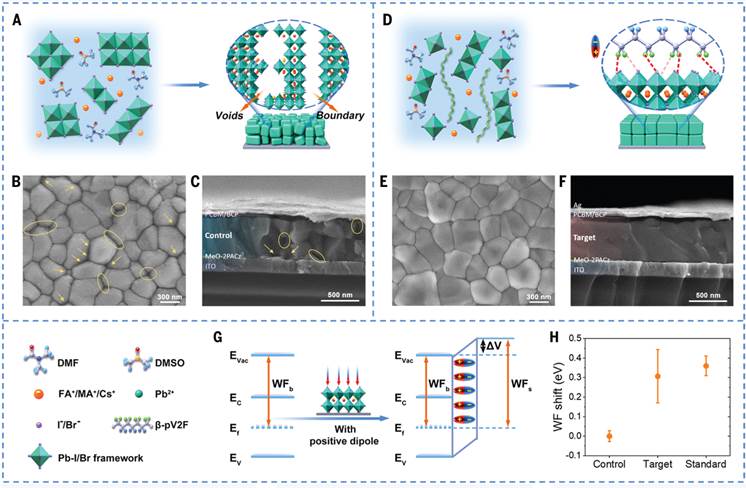 β-聚(1,1-二氟乙烯)(β-pV2F)聚合物具有有序交替对称的碳氢和碳氟化合物单元分子偶极分布,有序偶极结构的β-pV2F可以有效的改善钙钛矿薄膜的结晶性并对其实现能级调控,如图1所示。β-pV2F的引入使钙钛矿薄膜更加致密,同时有效的增大了晶粒尺寸(图1A-F)。有序聚合物不仅调节钙钛矿结晶过程,提升薄膜质量,而且提升了钙钛矿表面功函(增加了300 meV),促进了界面电荷提取。