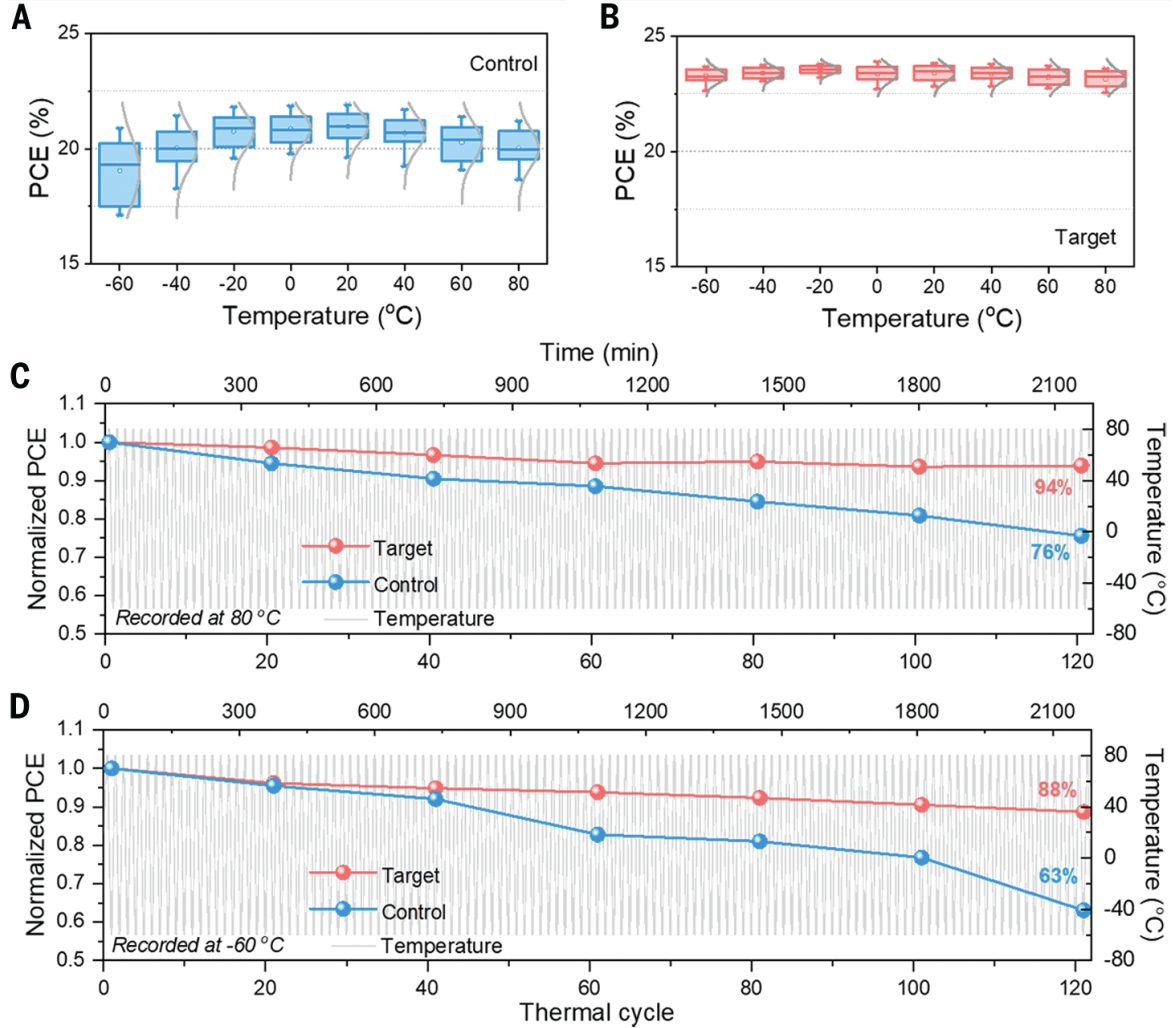 李萌教授课题组和德国亥姆霍兹柏林材料与能源中心Antonio Abate教授等合作,使用β-聚(1,1-二氟乙烯)聚合物偶极子调控钙钛矿薄膜的结晶及排列,构建了变温自调节光伏器件 获得了具有优异耐变温特性的高效钙钛矿太阳能电池。研究团队制备的p-i-n钙钛矿太阳能电池,有效面积18平方毫米的器件PCE达到了24.6%,1平方厘米的器件PCE达到了23.1%,在25°C和75°C下进行1个太阳光照射最大功率点跟踪1000小时后,分别保持了初始器件效率的96%和88%。在-60°C和+80°C之间快速变温循环下性能稳定超过一百个周期。