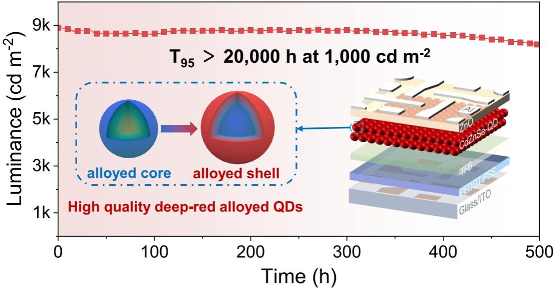 载流子注入的不平衡性仍制约着器件稳定性的提升,难以满足当前显示应用的要求。另一方面,合成发射波长超过630 nm(广色域的理想只选)的高质量CdSe QDs仍面临挑战。基于此,研究团队与北京理工大学合作合成了具有连续梯度、双合金核壳结构的深红色ZnCdSe/ZnSeS量子点实现了高性能深红色QLED的构筑。其中器件在200-90000 cd m-2亮度范围内其EQE超过20%,并且1000 cd m-2亮度下的T95寿命超过20000小时;此外,器件还具有出色的贮存稳定性(> 100 天)和循环稳定性(> 10个电压循环)。研究成果以“Ultrastable and High-Efficiency Deep Red QLEDs through Giant Continuously Graded Colloidal Quantum Dots with Shell Engineering”为题,发表在国际主流期刊Nano Letters上。实验室2019级硕士研究生刘校楠为第一作者,即时比分网
