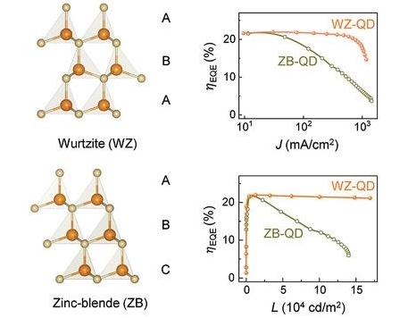 图2 纤锌矿和闪锌矿的晶体结构示意图,以及基于两种晶体结构的量子点电致发光器件的EQE-电流密度和EQE-亮度表征
