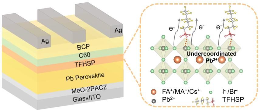 针对上述问题,课题组与德国亥姆霍兹柏林材料与能源中心李桂香博士团队合作,引入一种功能化的偶极分子十三氟己烷-1-磺酸钾(TFHSP)作为钙钛矿与电荷传输层的中间层。研究发现,偶极分子TFHSP在界面处诱导形成偶极钝化层,显著降低表界面缺陷,抑制非辐射复合,此外其可以改善界面处能带排列,增强电荷提取,减少电荷积累。优化的钙钛矿器件实现了24.6%的功率转换效率,且迟滞现象可以忽略不计。未封装的器件在相对湿度为60%的空气中放置1000 h仍保留其91%的初始效率。这项工作加深了对界面电荷行为的理解,并为实现高效稳定钙钛矿太阳能电池提供了新的途径。(DOI: 10.1002/adma.202407433)。