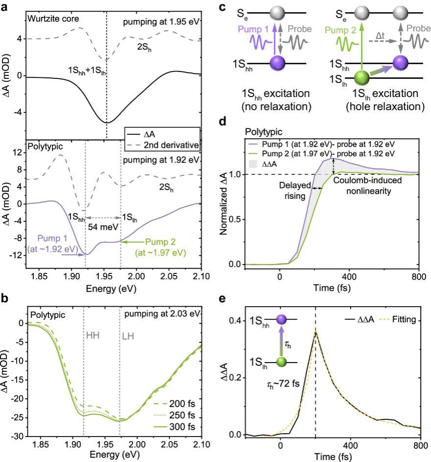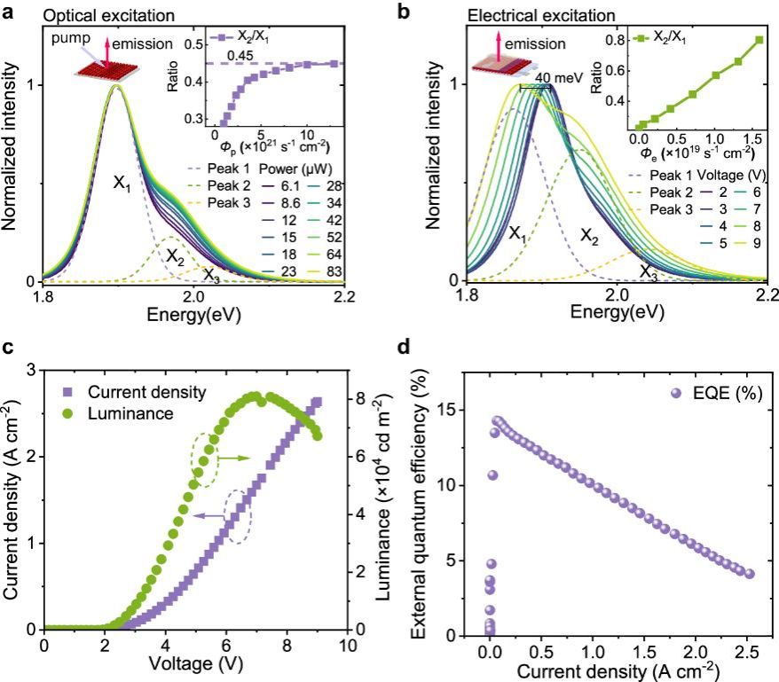为解决这一问题,河南大学申怀彬教授与中国科学技术大学樊逢佳教授合作,在闪锌矿-纤锌矿复合结构CdZnSe量子点发光二极管(QD-LED)结构中实现了热平衡状态下的高能激子的强电致发光。闪锌矿-纤锌矿复合结构量子点中,原本简并的轻空穴与重空穴发生劈裂,轻空穴形成的高能激子与重空穴形成的基态激子在热平衡下同时发光,其强度比例遵循玻尔兹曼分布和相对振子强度的乘积;在电致激发的情况下,轻空穴激子与重空穴激子受到的电场效应影响程度不同,轻空穴激子的相对振子强度进一步提高,从而仅需较低的电流密度(<2.5 A cm-2)与平均电子浓度(每个量子点中平均电子<0.35),即可有效实现高能激子的电致发光,其光强占比最高可达基态发光的80%。相关研究成果以“Strong high-energy exciton electroluminescence from the light holes of polytypic quantum dots”为题,发表在《Nature Communications》杂志上(//doi.org/10.1038/s41467-024-50432-8)。