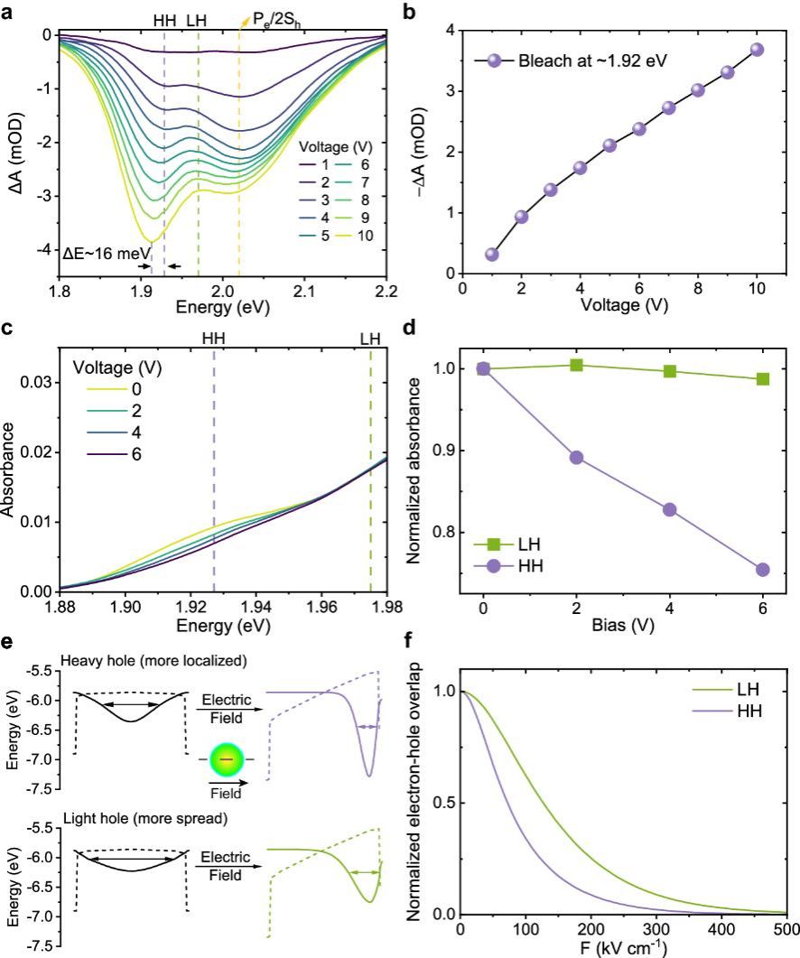 在过去的研究中,高能级激子的发光依赖于大量载流子注入导致的基态饱和。在本研究中,我们借助研究团队设计的电激发瞬态吸收系统,对QD-LED中的载流子数量进行了分析。结果表明,即使在10 V的电压下,平均每个量子点中的电子数量仍不会大于0.35个,更达不到基态空穴的饱和。此外,轻重空穴的有效质量不同,在同样的外电场下,受到电场效应的影响程度不同,轻空穴在外电场下振子强度的减少程度小于重空穴,从而导致电致激发下,轻空穴激子的相对振子强度上升,实现了低注入,高占比的轻空穴发光。这项工作为开发高性能白光光源和多色光源打开了一扇大门。