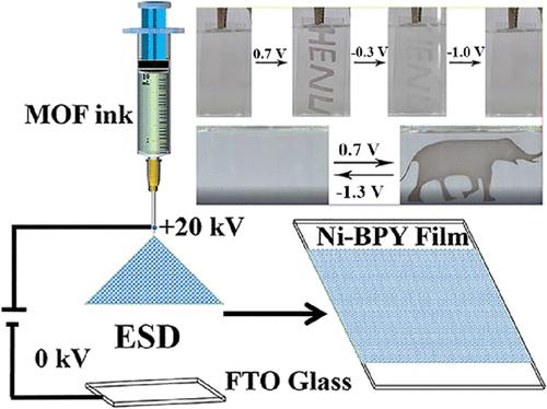 金属-有机框架(Metal-Organic Frameworks,MOFs)材料由于其本征导电性差的原因,使得其在电化学领域的应用受限。针对上述原因,电致变色课题组提出了混合配体策略构筑paddle-wheel结构金属-有机框架的策略。利用离域吡啶配体增加与金属节点的轨道重叠程度进而改善材料的导电性能,并进一步利用静电喷涂的方式将其制备成薄膜。获得的薄膜实现了MOFs材料在水系KOH体系中透明到棕黑色的电致变色性能,并且基于多孔策略实现了其褪色过程的分步调控特性。该成果以Transparent-to-Brown-Black Patterned Electrochromic Metal−Organic Frameworks为题发表在期刊ACS Applied Materials&Interfaces上。即时足球比分网 | 实时赛事结果更新