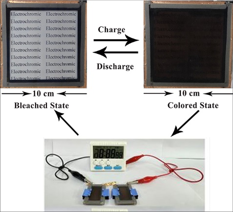 图2.大面积Ni-DPNDI电致变色光学照片及其电子表驱动。