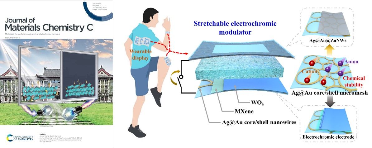 另一方面,开发具有高光学调制和长循环稳定性的WO3电致变色材料仍然具有挑战性,课题组以过氧化氢 (H2O2) 作为绿色络合剂, 乙二醇 (EG) 作为桥接剂, 提出了在导电衬底上低温高效原位生长WO3·0.33H2O薄膜的一步制备策略。该薄膜展现出可见-近红外宽波段范围内全面的电致变色性能,包括大光学调制、高着色效率和良好的循环稳定性。该成果以“In-Situ Efficient growth of Rubik nanocube WO3·0.33H2O array films for high-performance electrochromic energy storage device”为题发表在Journal of Materials Chemistry C期刊上, 并入选封面论文和hot article(//pubs.rsc.org/en/content/articlepdf/2024/tc/d3tc04207c)。博士研究生贾森森为第一作者,王金辉老师和蔡国发教授为通讯作者。