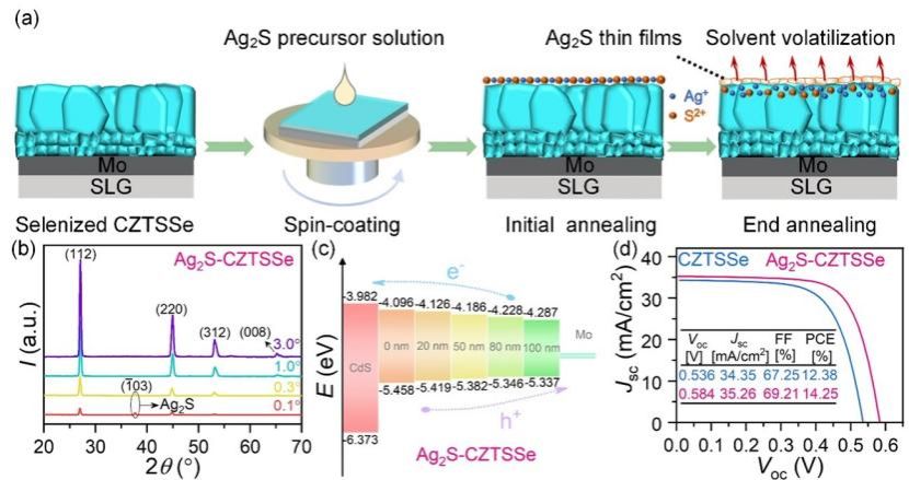 图1. Ag2S改性CZTSSe薄膜的制备工艺和器件性能