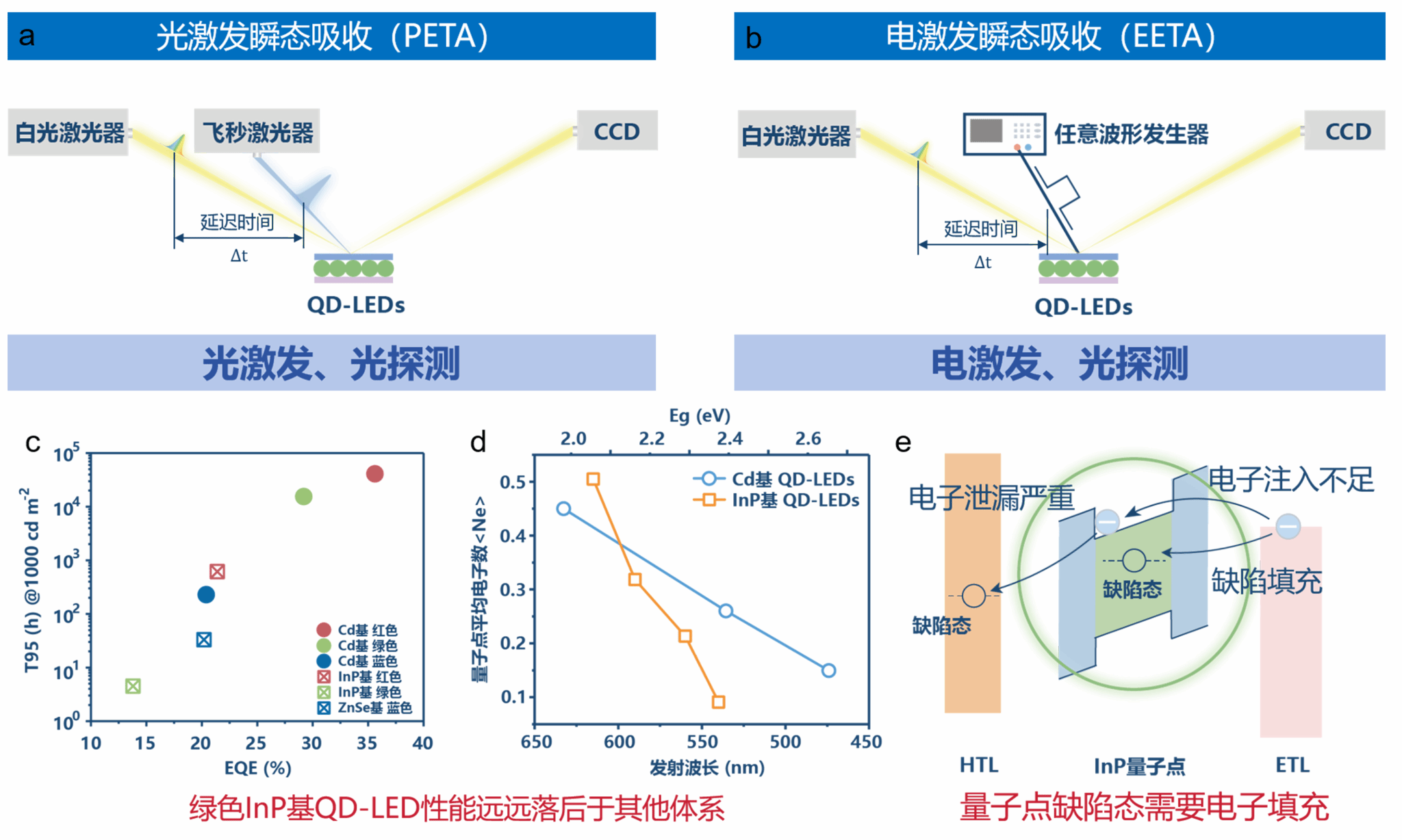 本研究揭示了绿色InPQD-LED效率低下的关键原因,并提供了有效的解决方案,同时实现了电子注入提升和电子泄漏抑制,也为高性能QD-LED的设计提供了新思路。