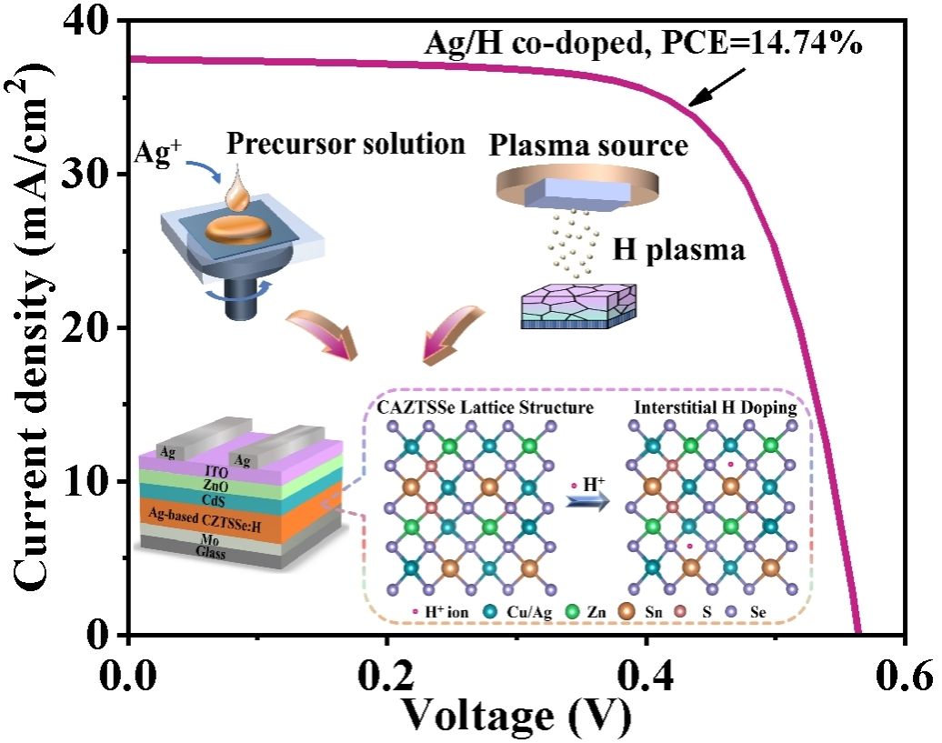 CZTSSe光伏吸收层中SnZn相关缺陷的存在导致了较大的不可逆能量损失和额外的不可逆电子空穴非辐射复合,从而阻碍了CZTSSe器件效率的提高。虽然在CZTSSe中引入Ag可以有效地抑制SnZn相关缺陷,并显著提高电池性能,但由于银取代导致CZTSSe薄膜的导电性差和载流子浓度低,因此到目前为止还没有实现良好的效率。在此,本研究巧妙地设计了一种Ag/H共掺杂策略,通过Ag取代和氢等离子体处理来协同抑制SnZn缺陷,从而实现高效的CZTSSe器件。深入研究结果表明,在银基CZTSSe吸收层中引入H有望改善银取代引起的导电性差和载流子浓度低的问题。重要的是,氢引入诱导的C=O和O-H官能团作为电子供体,可以与CZTSSe材料中的欠配位阳离子相互作用,有效钝化SnZn相关缺陷。因此,在CZTSSe中引入适量的Ag/H可以抑制载流子的非辐射复合,延长少数载流子的寿命,最终获得了14.74%的器件效率,显示了其在锌黄锡矿基CZTSSe器件中良好的应用前景。